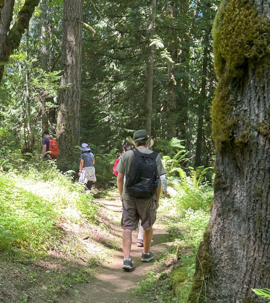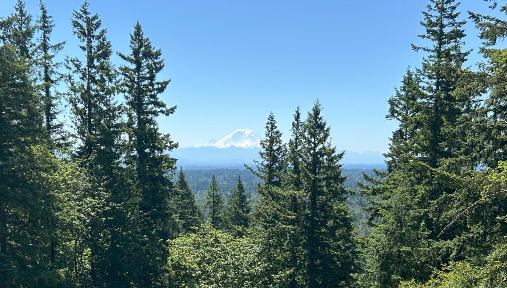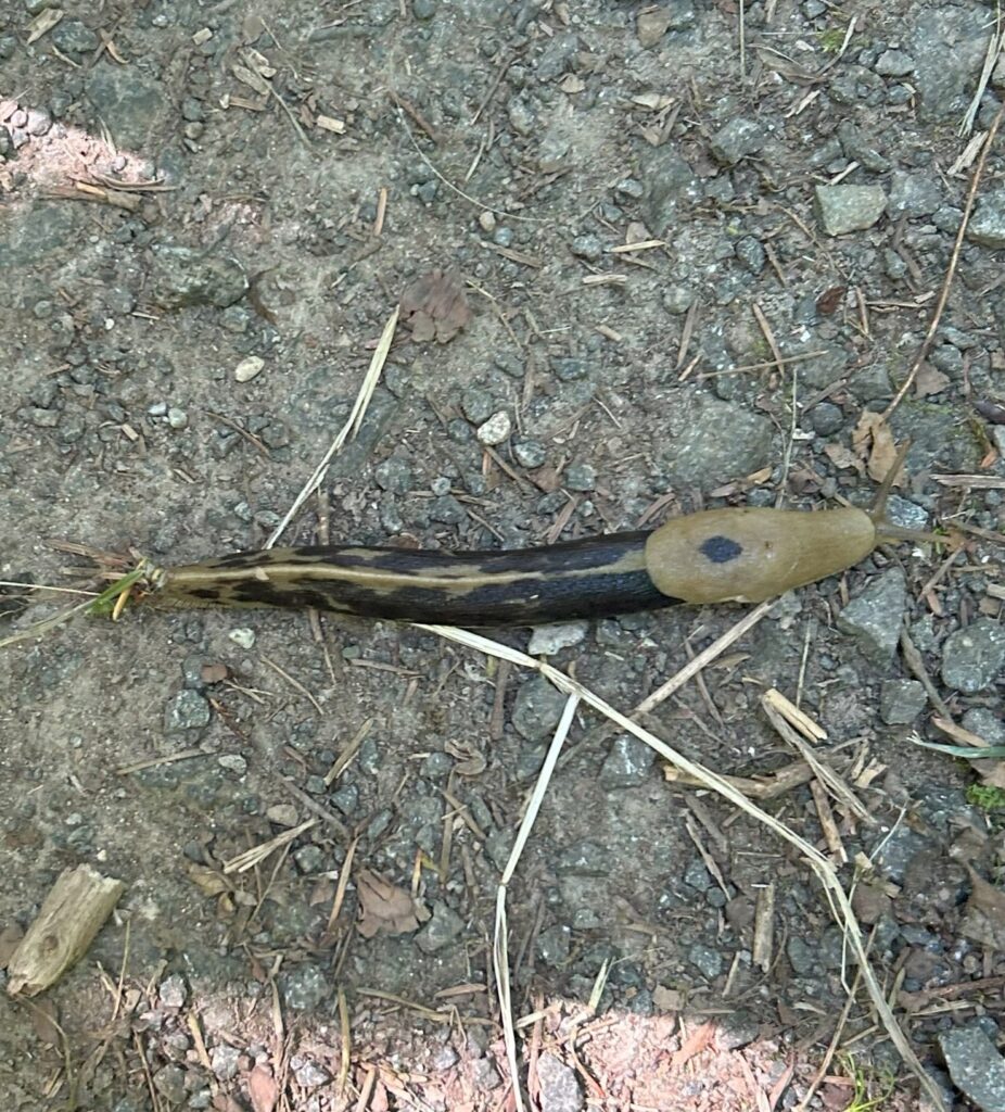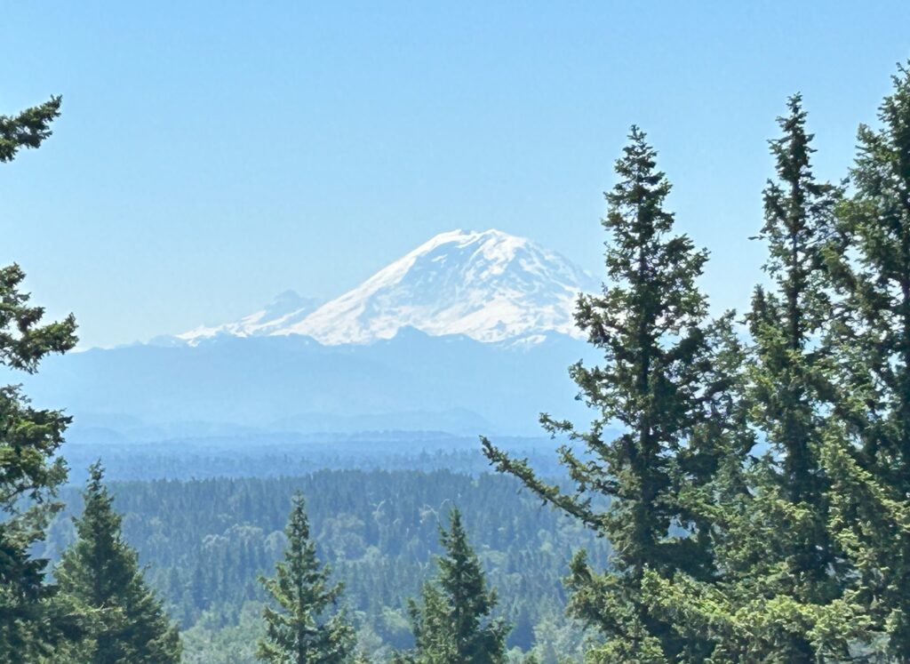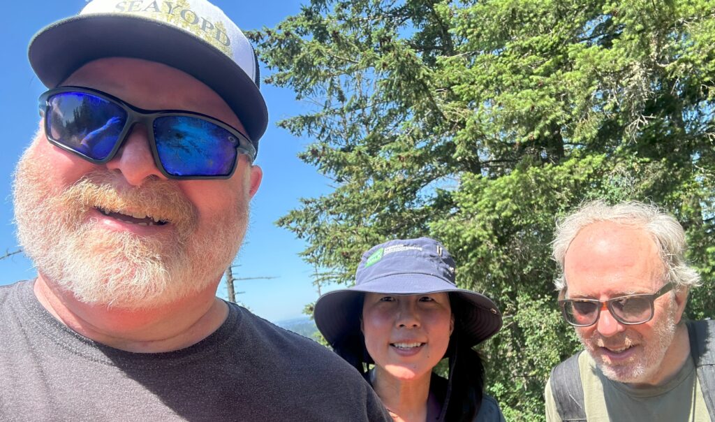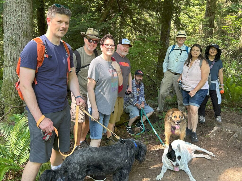 On the hottest day so far in 2025, 8 people and 3 dogs gathered to soak up the energy of the forest and the vibes from being with other that have YOPD. WE had 4 new people show up at an event. We saw a deer while waiting to get started. Su saw a snake and a baby squirrel. WE all got to see this giant slug. He must have been 5" long and was the only moving slow enough to get a photo. We chatted as we stepped over roots and rocks. Making Friends and dopamine! 3 in our group made it to the peak and were treated to a magnificent view of MT Rainier.